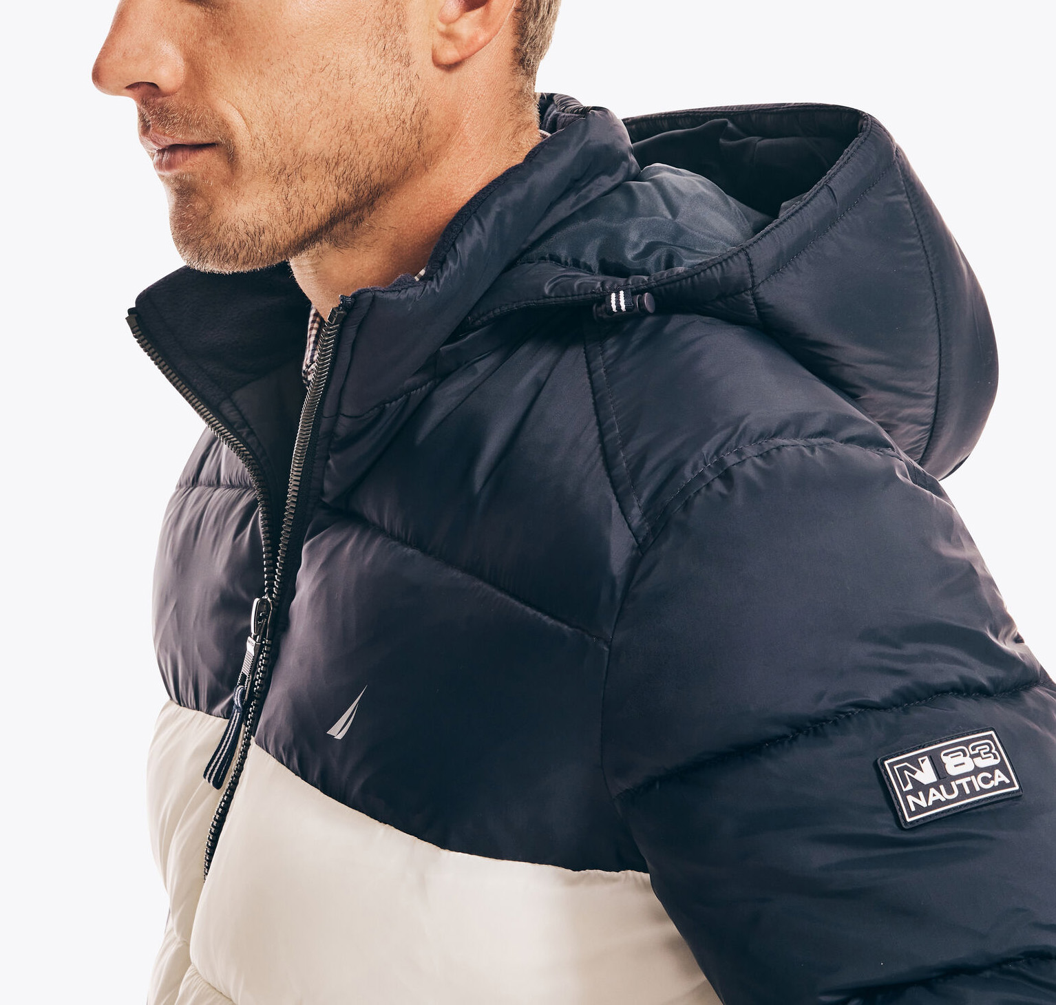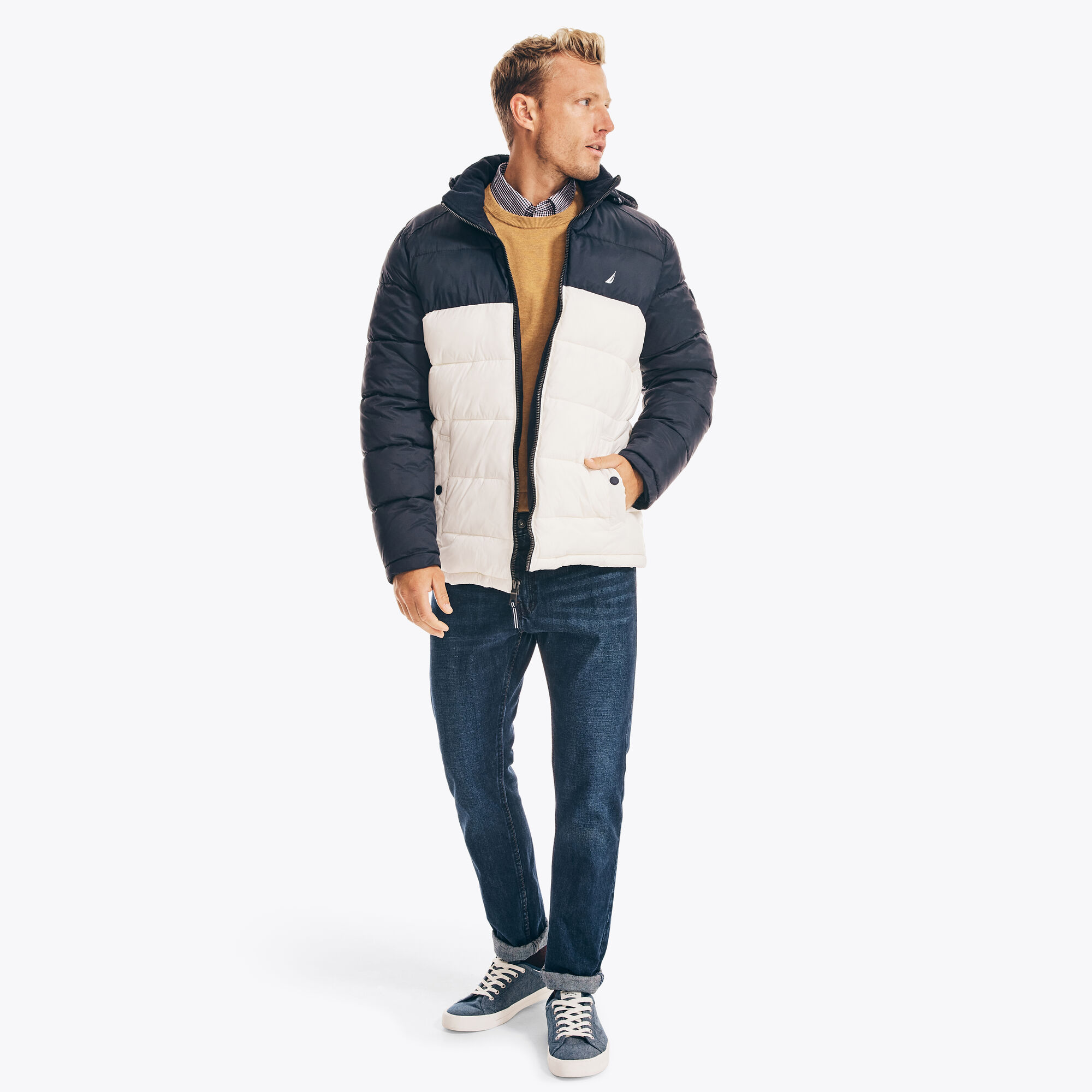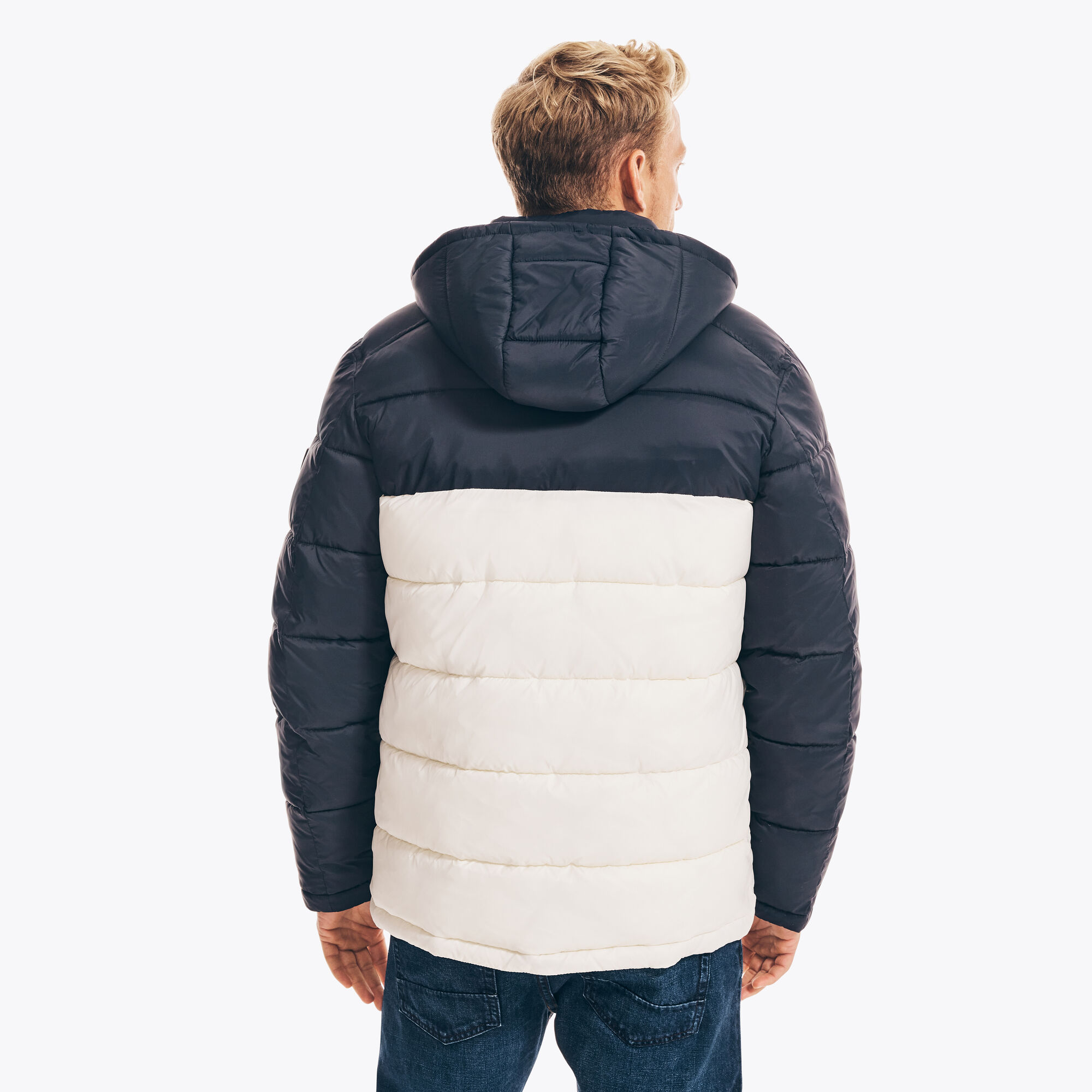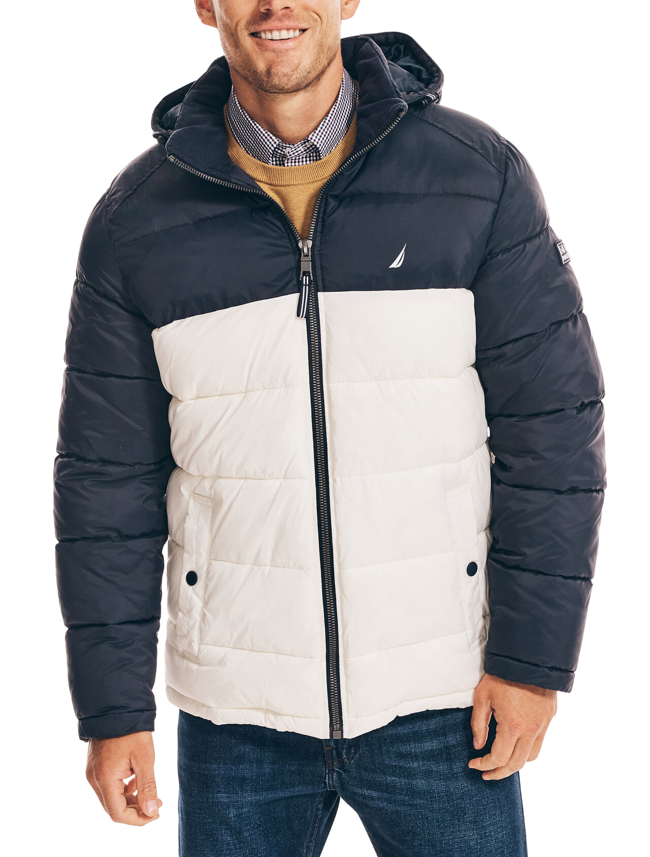 Μπουφάν Nautica ανδρικό Perfect for cooler weather, this colorblock puffer jacket features a quilted design for extra warmth and comfort. It's complete with all the classic details: a hood, side seam pockets, and a full-zip closure.