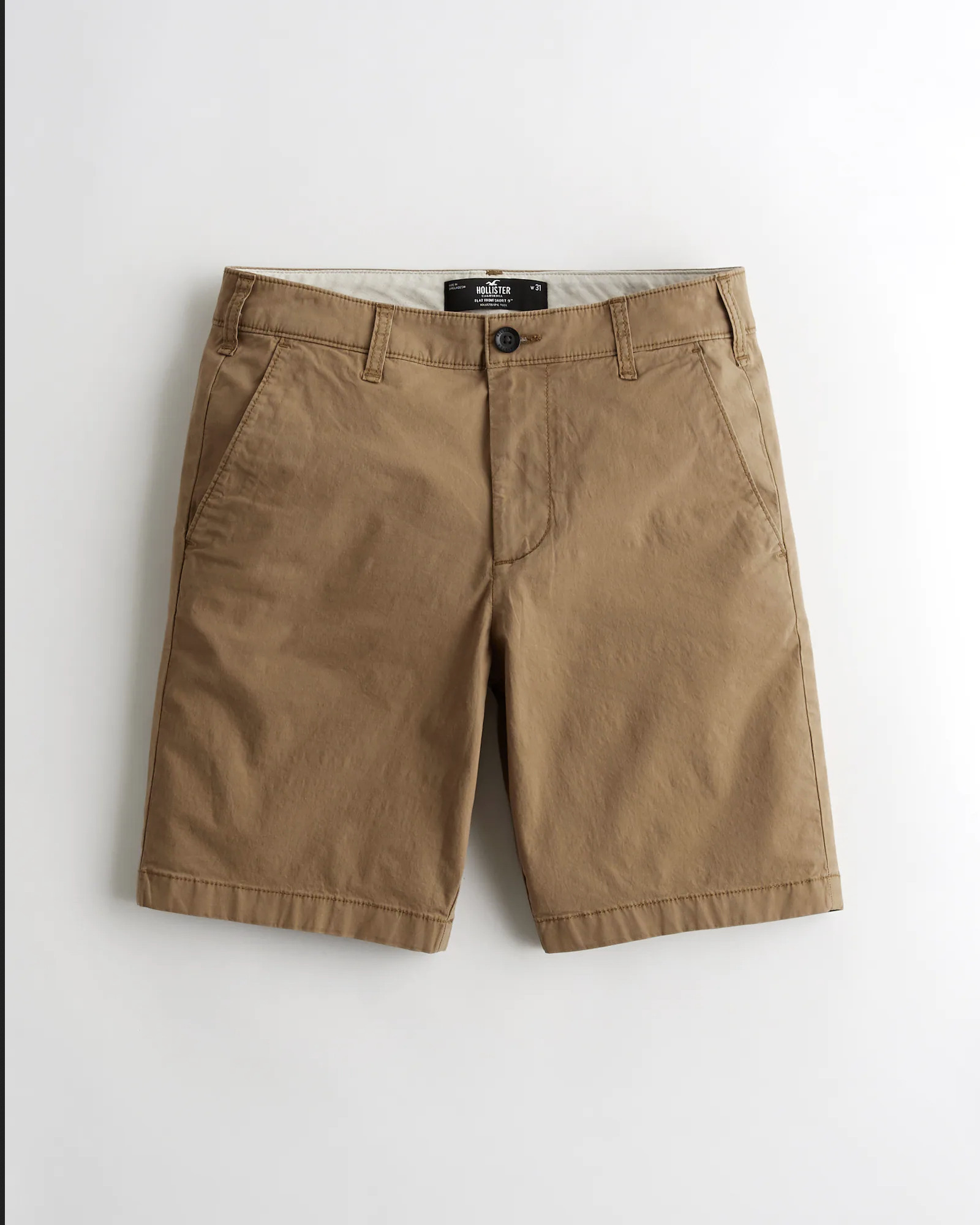 Hollister ανδρική βερμούδα. Flat Front Short 9" Classic twill flat-front shorts featuring side pockets and a button closure. 9” inseam. Imported. Body:98% Cotton, 2% Elastane