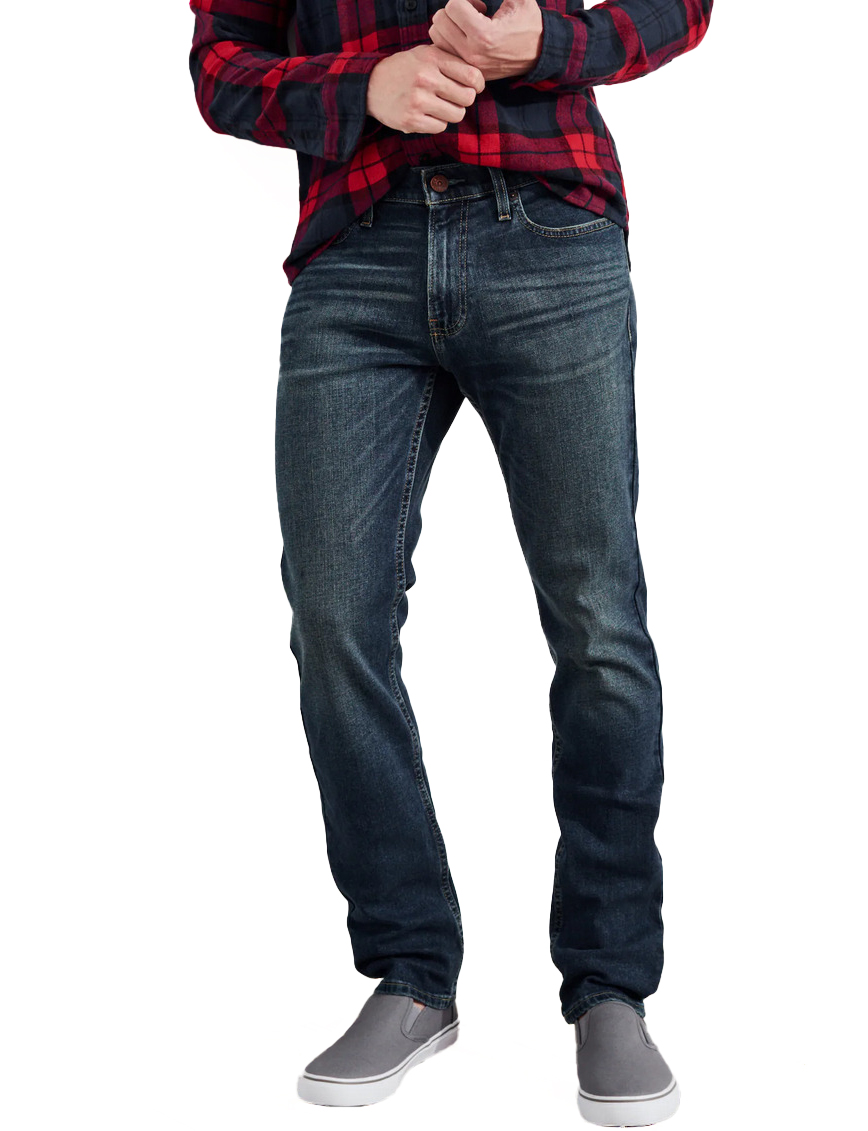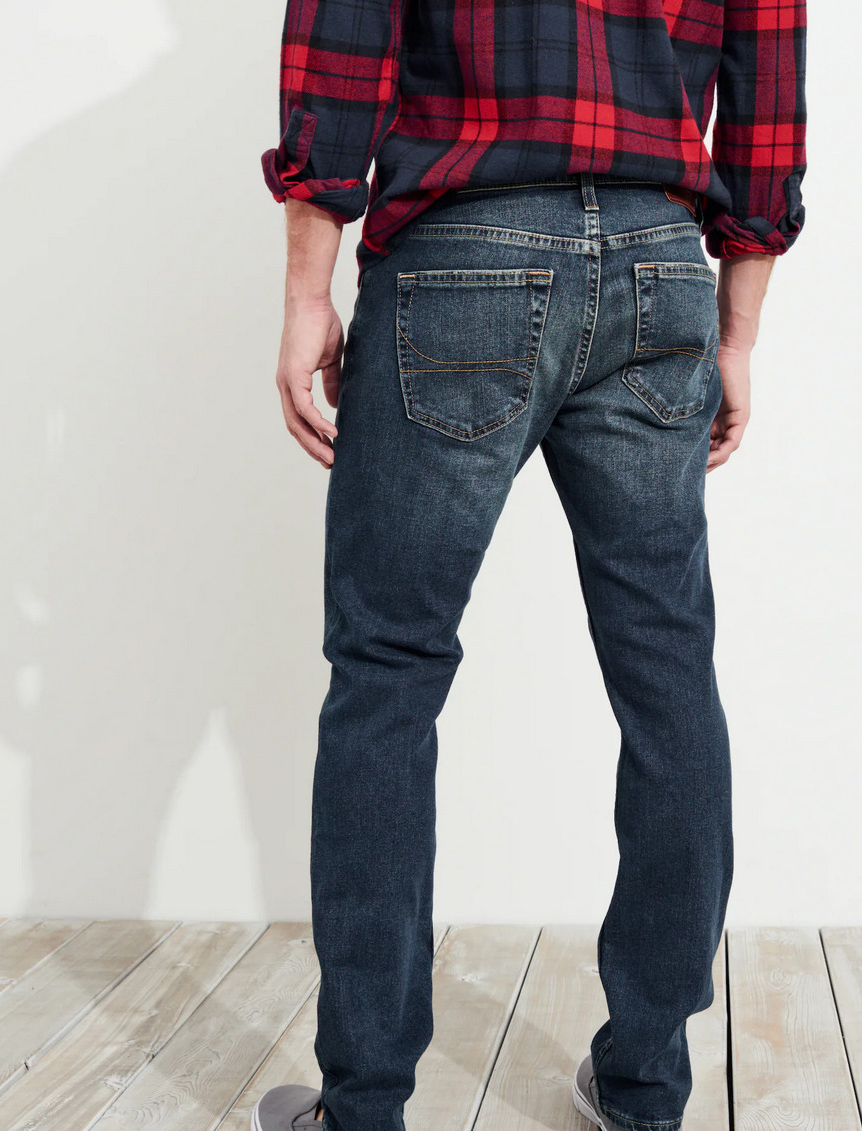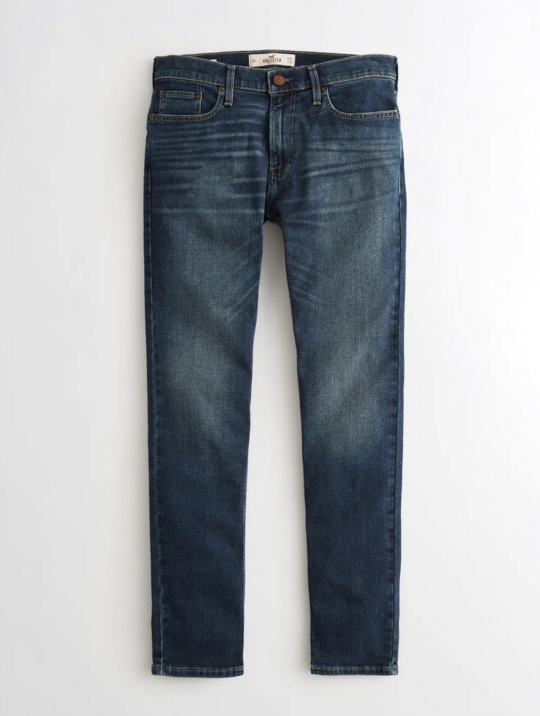 Designed with a slim fit through the hip and thigh with a 14” leg opening, featuring medium wash denim made with Hollister Epic Flex stretch, fading and whiskering, a right coin pocket and iconic back pocket embroidery