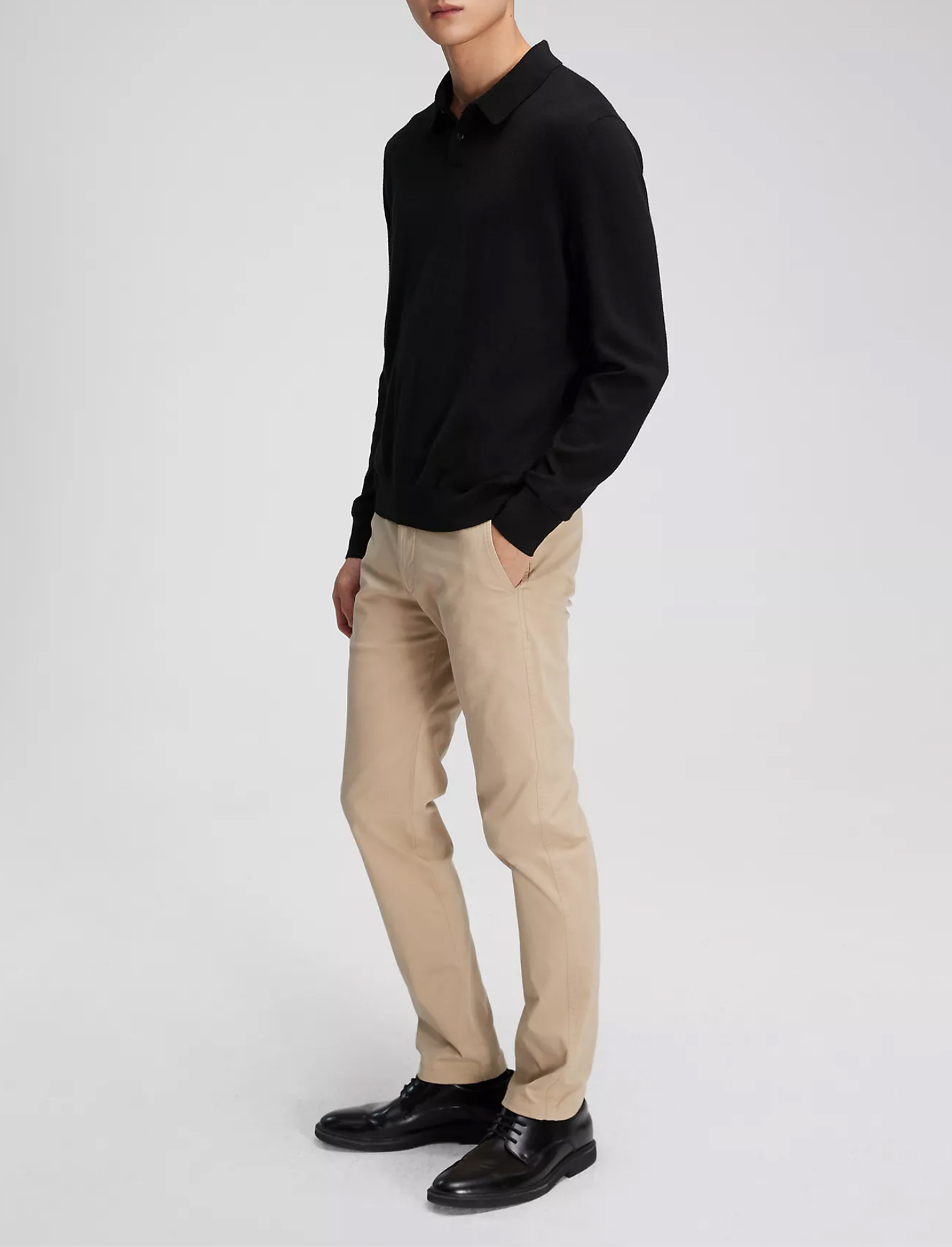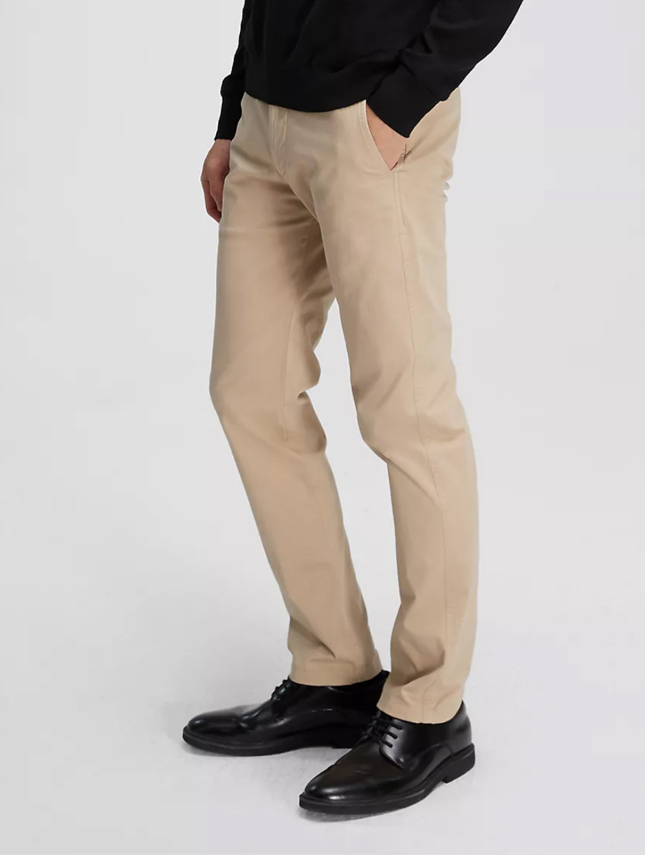 Styled in a slim fit, these chino pants are a versatile piece suited for both elevated and casual outfits. Crafted from a cotton stretch blend for breathable comfort and effortless wear. Made with a medium rise waist and slip pockets at both sides.