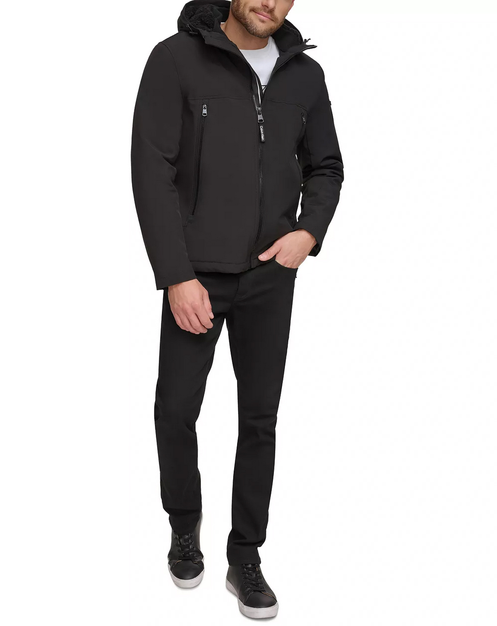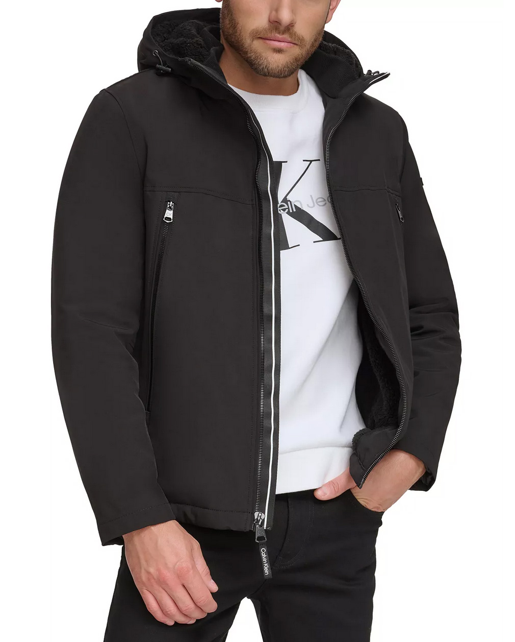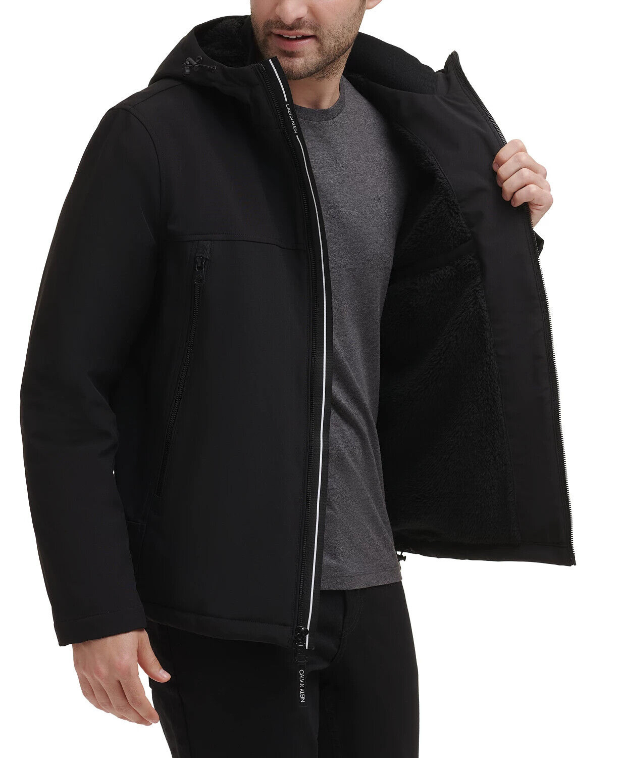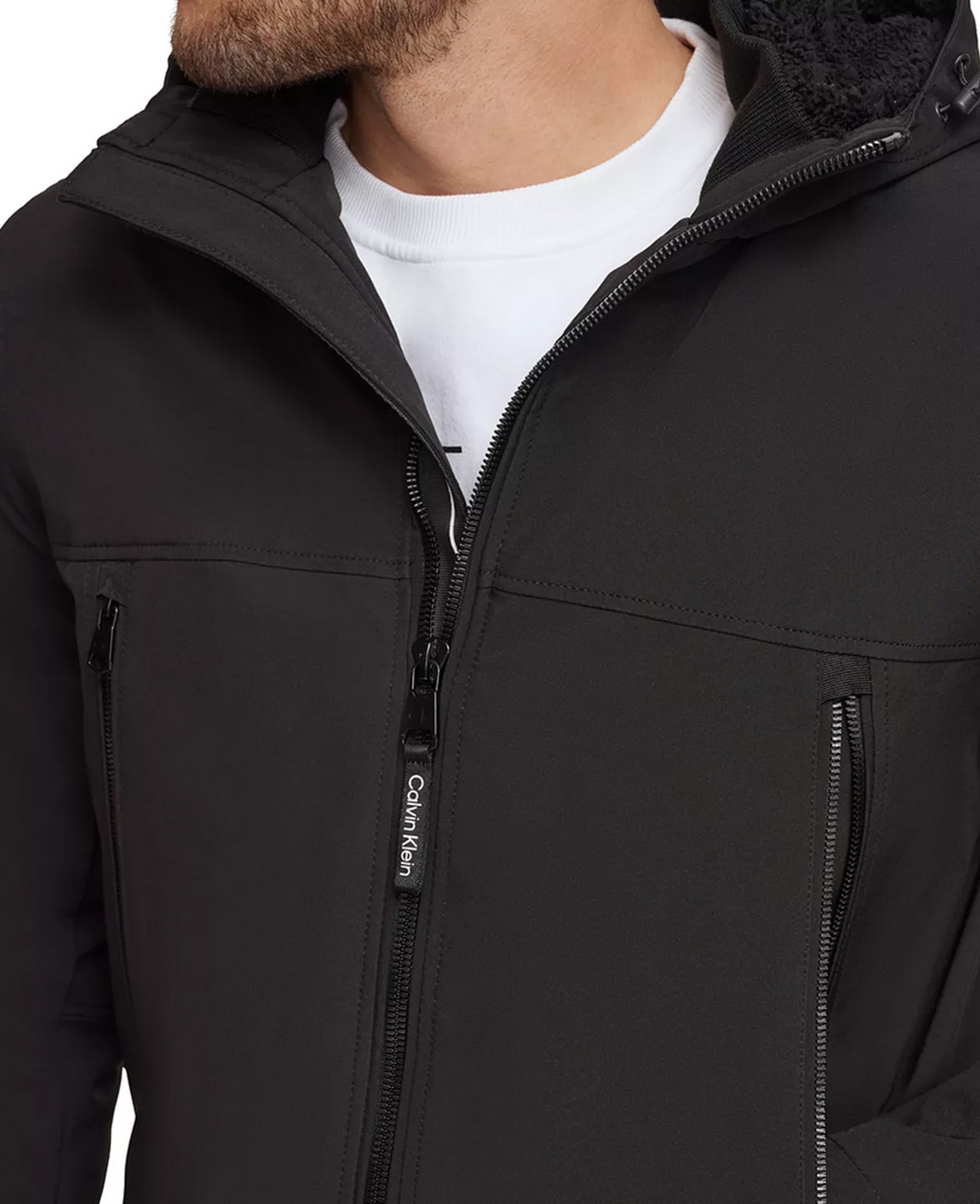 A jacket that is as comfortable as it is stylish, the Calvin Klein Men's Sherpa Lined Infinite Stretch Soft Shell Jacket is a must-have. This jacket is perfect for those cool, crisp days when you don't want to wear anything too heavy. Beat the chills with this stylish hooded jacket from Calvin Klein, featuring handy zip pockets at the front.
