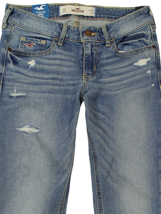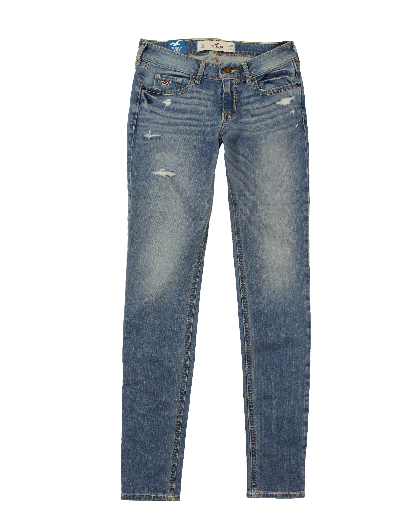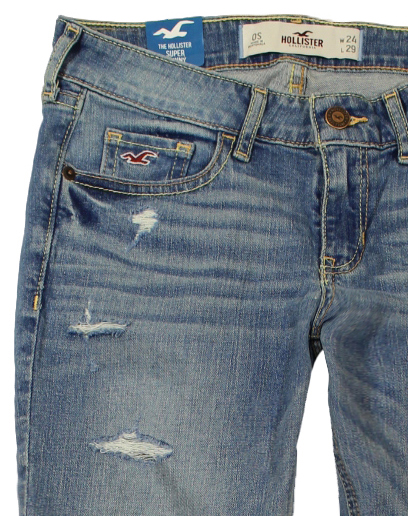 Ανοιχτόχρωμο jean super skinny με μικρά σκισίματα και κεντητό λογότυπο Hollister στην τσέπη.