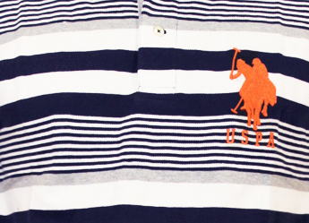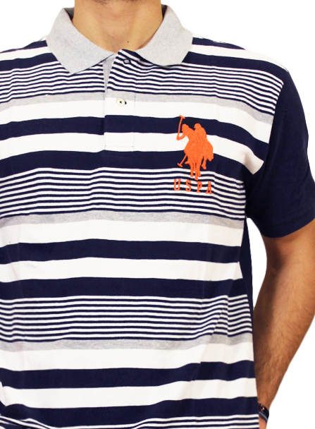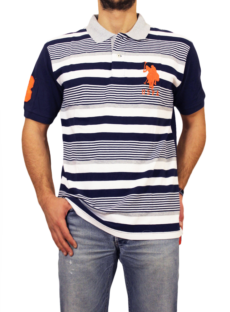 Πόλο Τ-shirt με μπλέ και λευκές ρίγες. Κεντητό λογότυπο της US POLO ASSN σε πορτοκαλί χρώμα και αριθμό στο μανίκι.