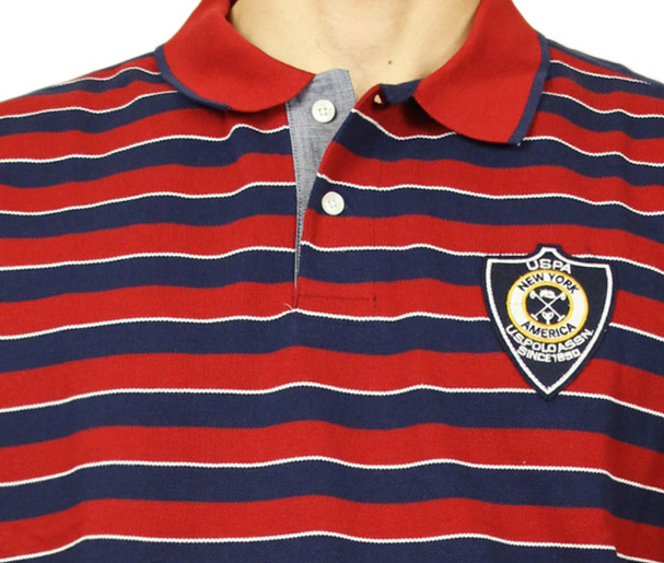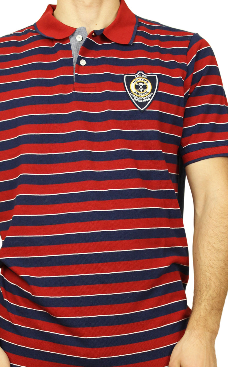 US POLO T-shirt ανδρικό με γιακά και ρίγες σε μπλέ και κόκκινο χρώμα.Κεντημένο λογότυπο της εταιρείας στο μπροστινό μέρος της μπλούζας.