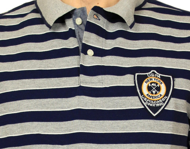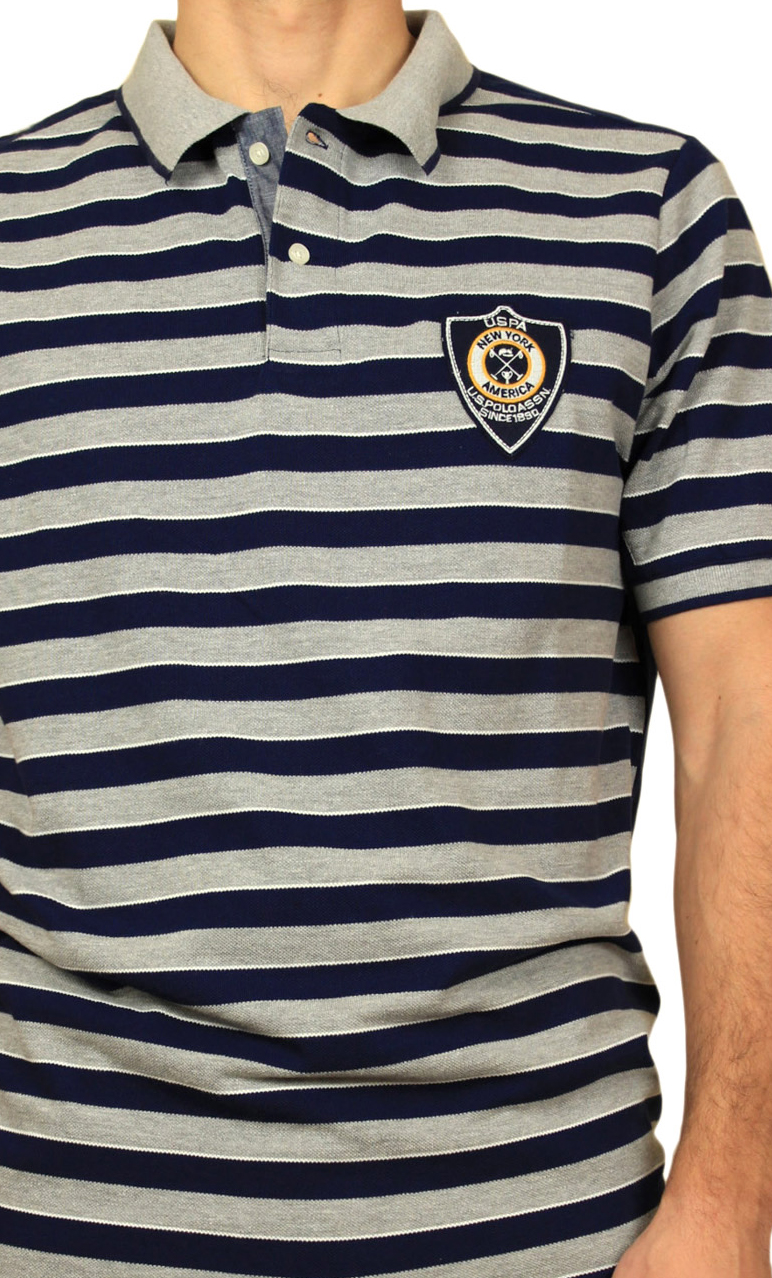 US POLO T-shirt ανδρικό με γιακά και ρίγες σε μπλέ και γκρί χρώμα.Κεντημένο λογότυπο της εταιρείας στο μπροστινό μέρος της μπλούζας.