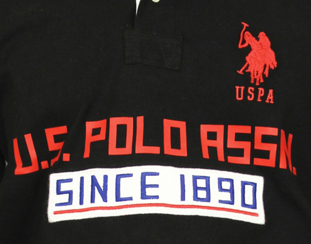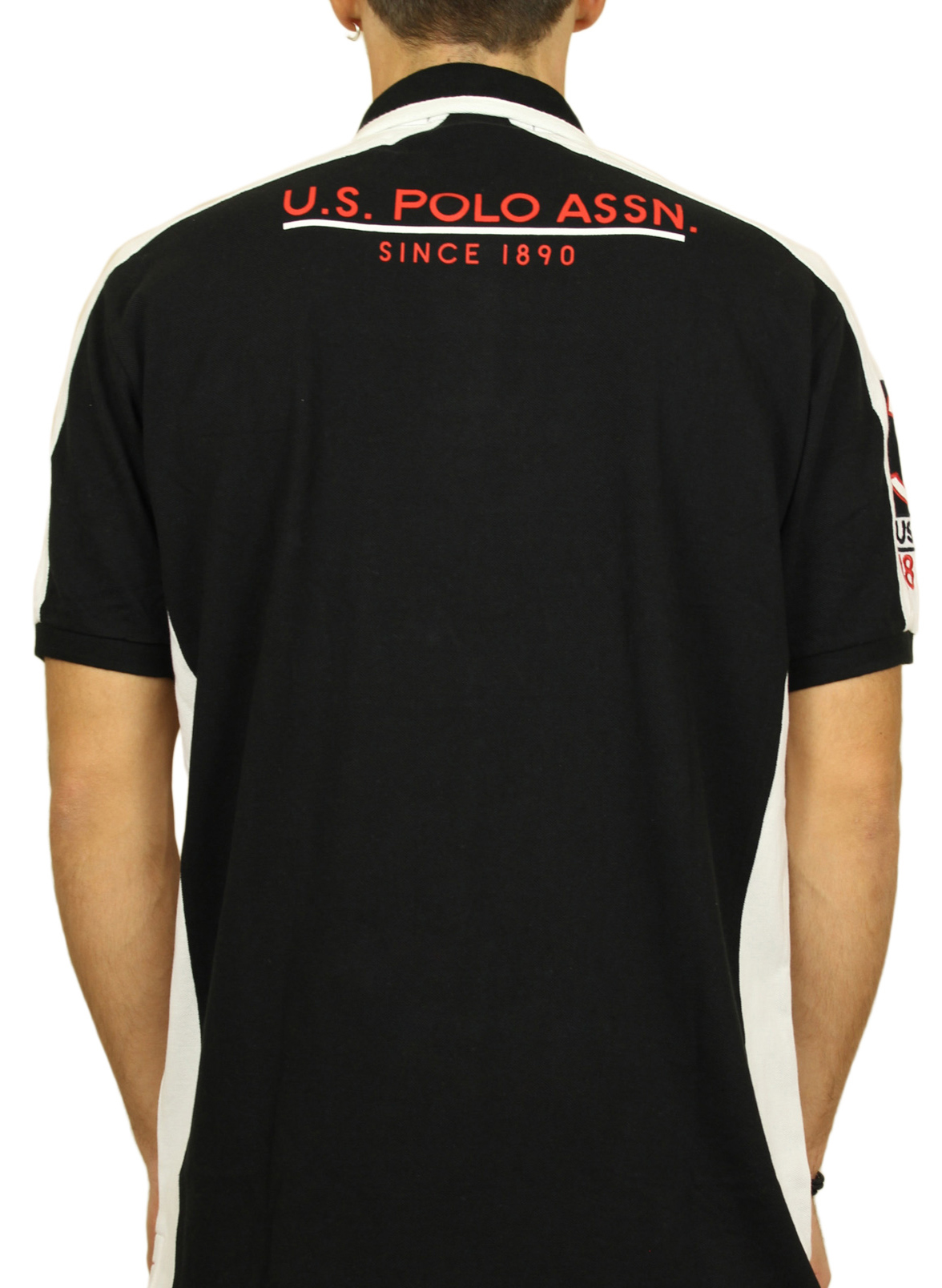 T-shirt polo US POLO ASSN σε μαύρο χρώμα με λευκές λεπτομέρειες και κεντημένα λογότυπα της εταιρείας στο μπροστινό μέρος της μπλούζας.