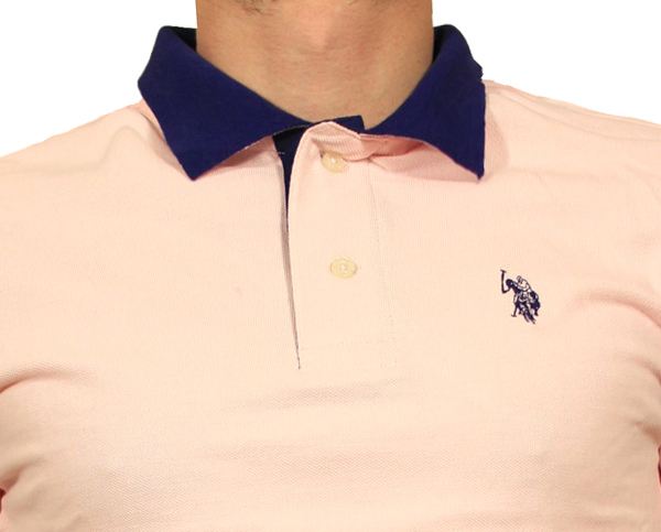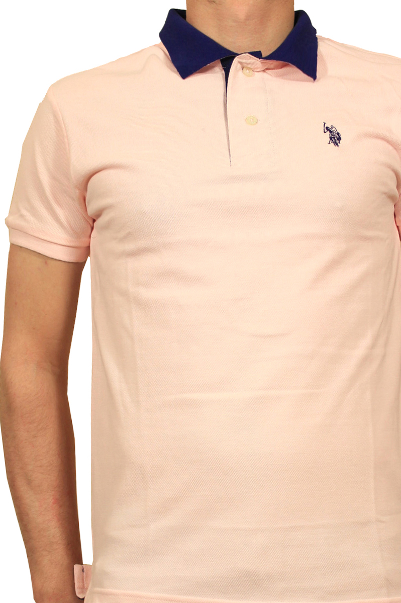 Us polo T-shirt ανδρικό σε ρόζ ανοιχτή απόχρωση με μπλέ γιακά και λογότυπο της γνωστής εταιρείας στο ίδιο χρώμα στο μπροστινό μέρος της μπλούζας.